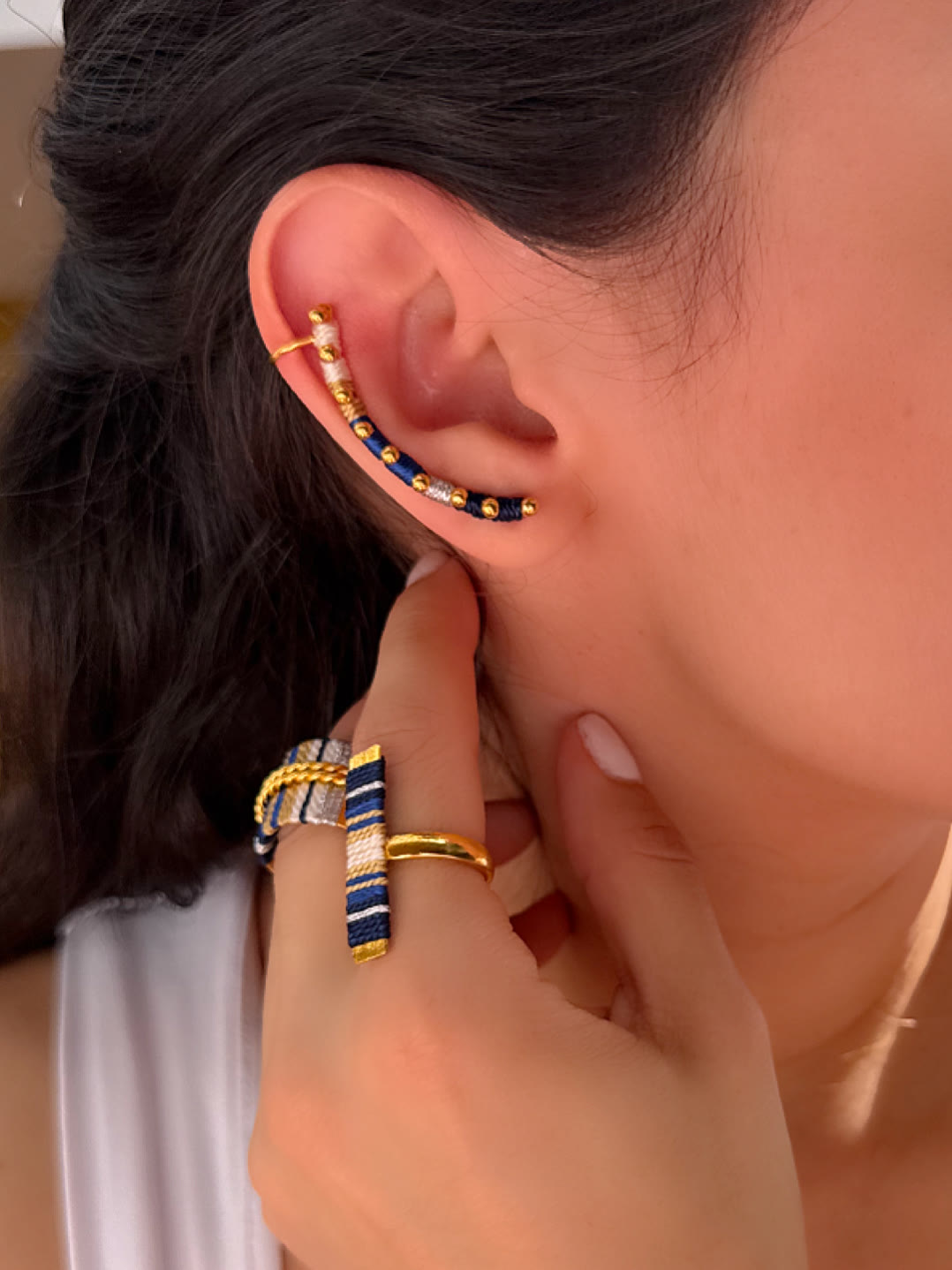Elegancia de lo hecho a mano, Anillo artesanal en hilo seda, elaborada con herrajes en bronce de alta calidad y un doble baño de oro de 24k. Cada pieza es una creación única, hecha en Colombia, pensada para mujeres que valoran la exclusividad, el diseño artesanal y la moda consciente.