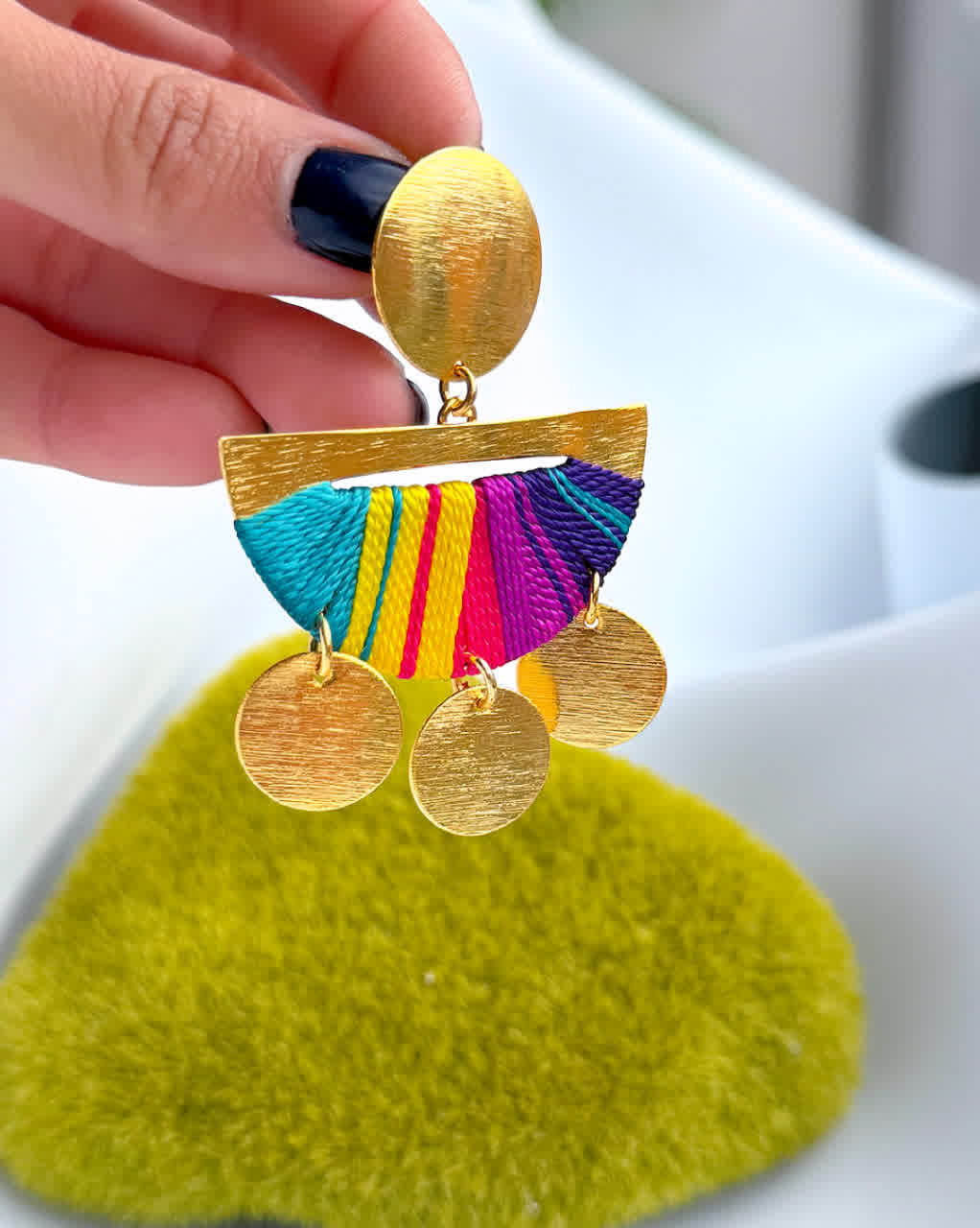 Elegancia de lo hecho a mano, Arete artesanal en hilo seda, elaborada con herrajes en bronce de alta calidad y un doble baño de oro de 24k. Cada pieza es una creación única, hecha en Colombia, pensada para mujeres que valoran la exclusividad, el diseño artesanal y la moda consciente.