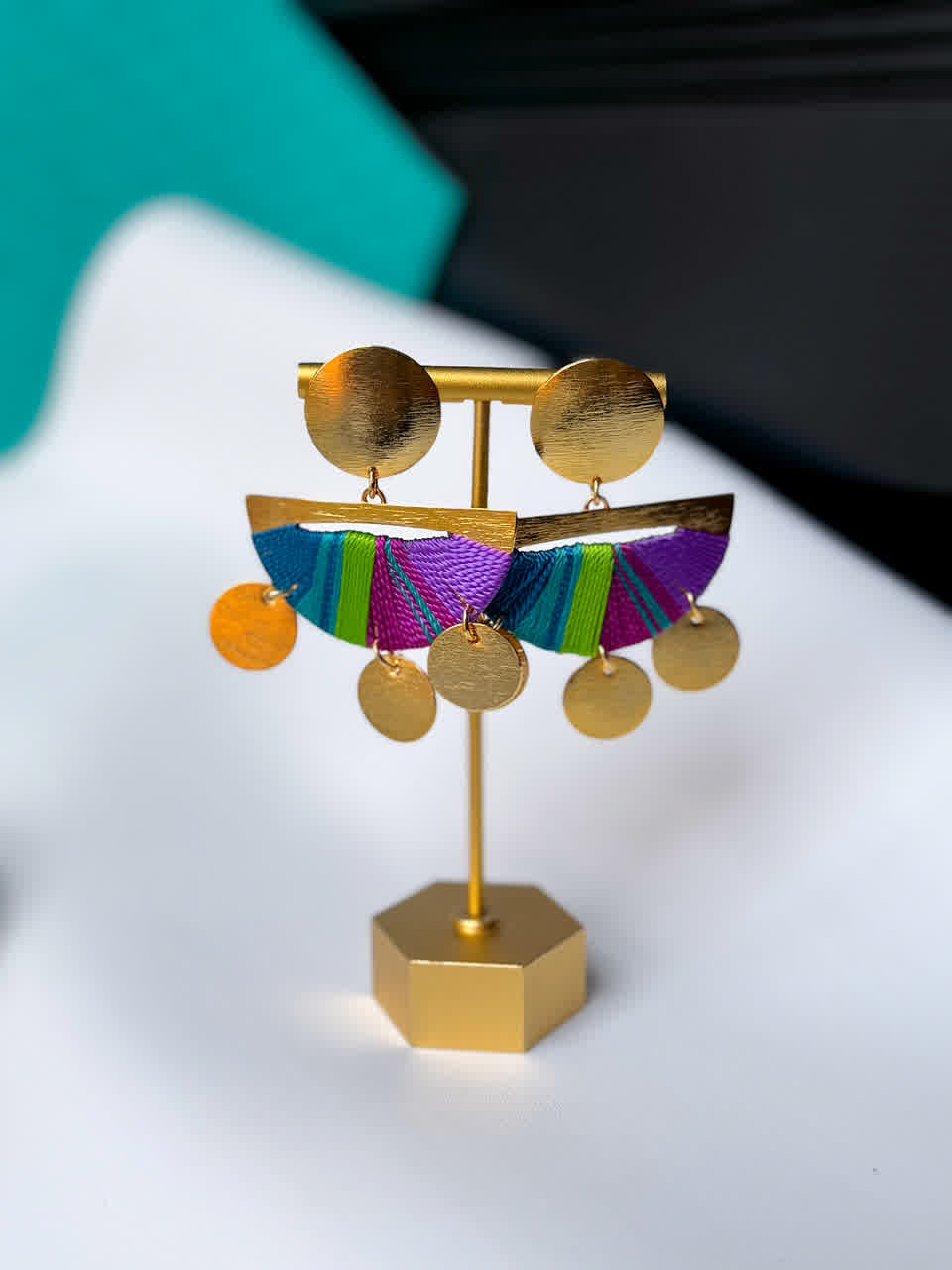 Elegancia de lo hecho a mano, Arete artesanal en hilo seda, elaborada con herrajes en bronce de alta calidad y un doble baño de oro de 24k. Cada pieza es una creación única, hecha en Colombia, pensada para mujeres que valoran la exclusividad, el diseño artesanal y la moda consciente.
