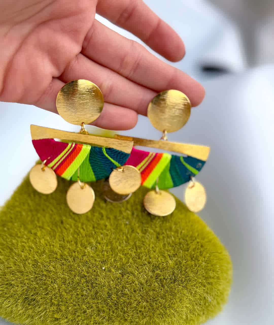 Elegancia de lo hecho a mano, Arete artesanal en hilo seda, elaborada con herrajes en bronce de alta calidad y un doble baño de oro de 24k. Cada pieza es una creación única, hecha en Colombia, pensada para mujeres que valoran la exclusividad, el diseño artesanal y la moda consciente.