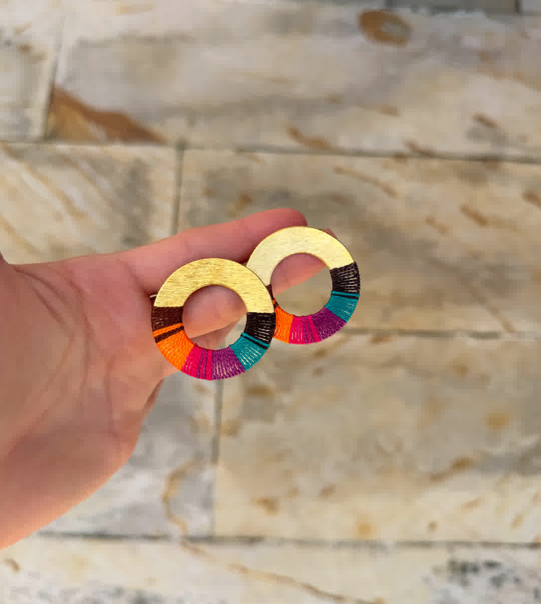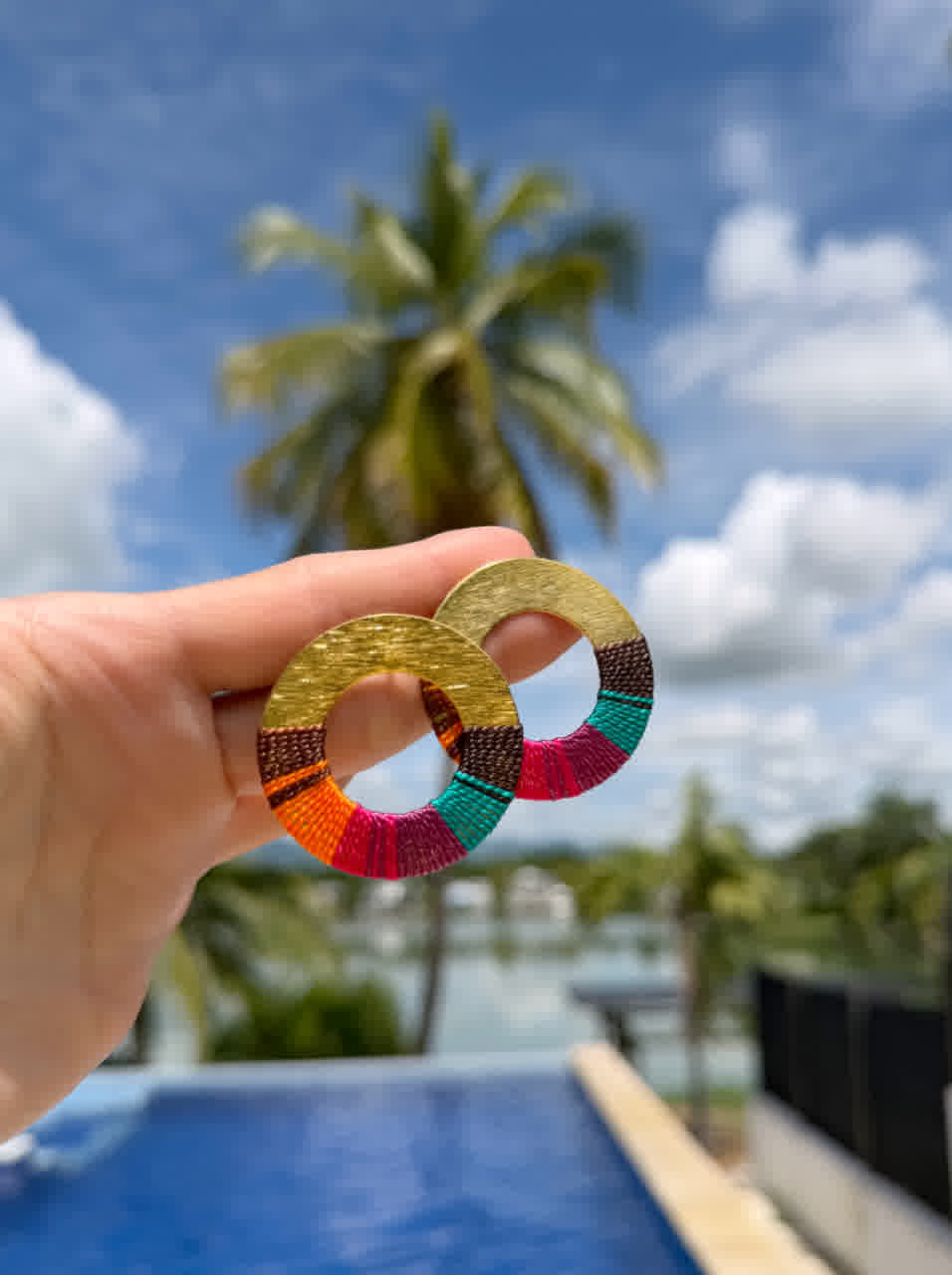 Elegancia de lo hecho a mano, Arete artesanal en hilo seda, elaborada con herrajes en bronce de alta calidad y un doble baño de oro de 24k. Cada pieza es una creación única, hecha en Colombia, pensada para mujeres que valoran la exclusividad, el diseño artesanal y la moda consciente.