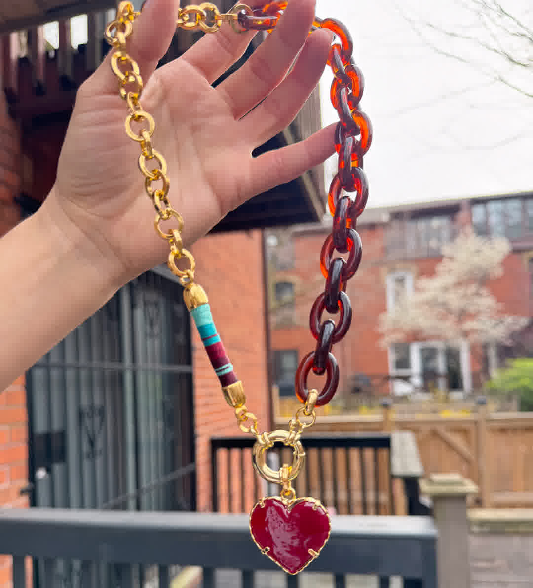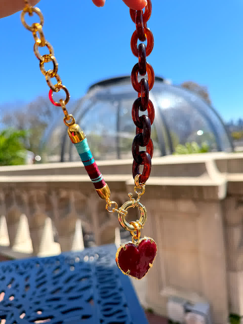 - Material: resina ecologica, Hilo seda y bronce con baño de oro 24k, corazon en vitrofusion