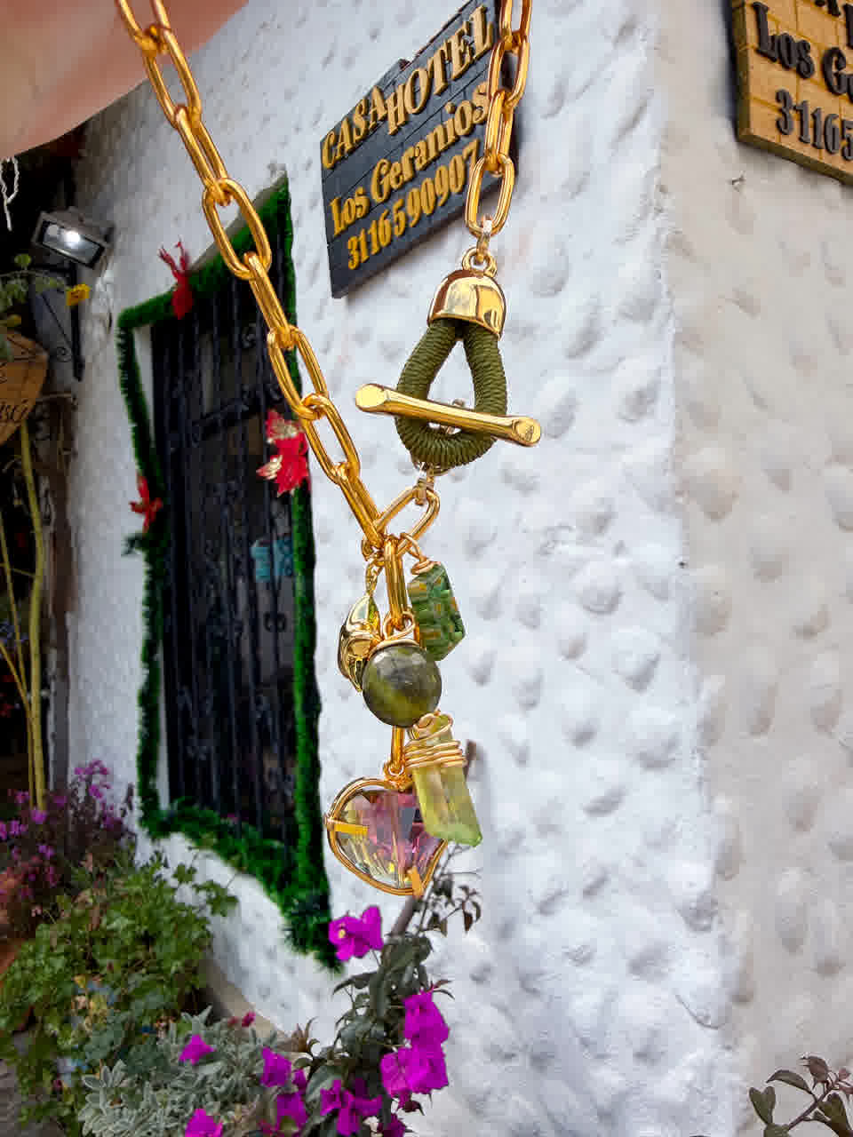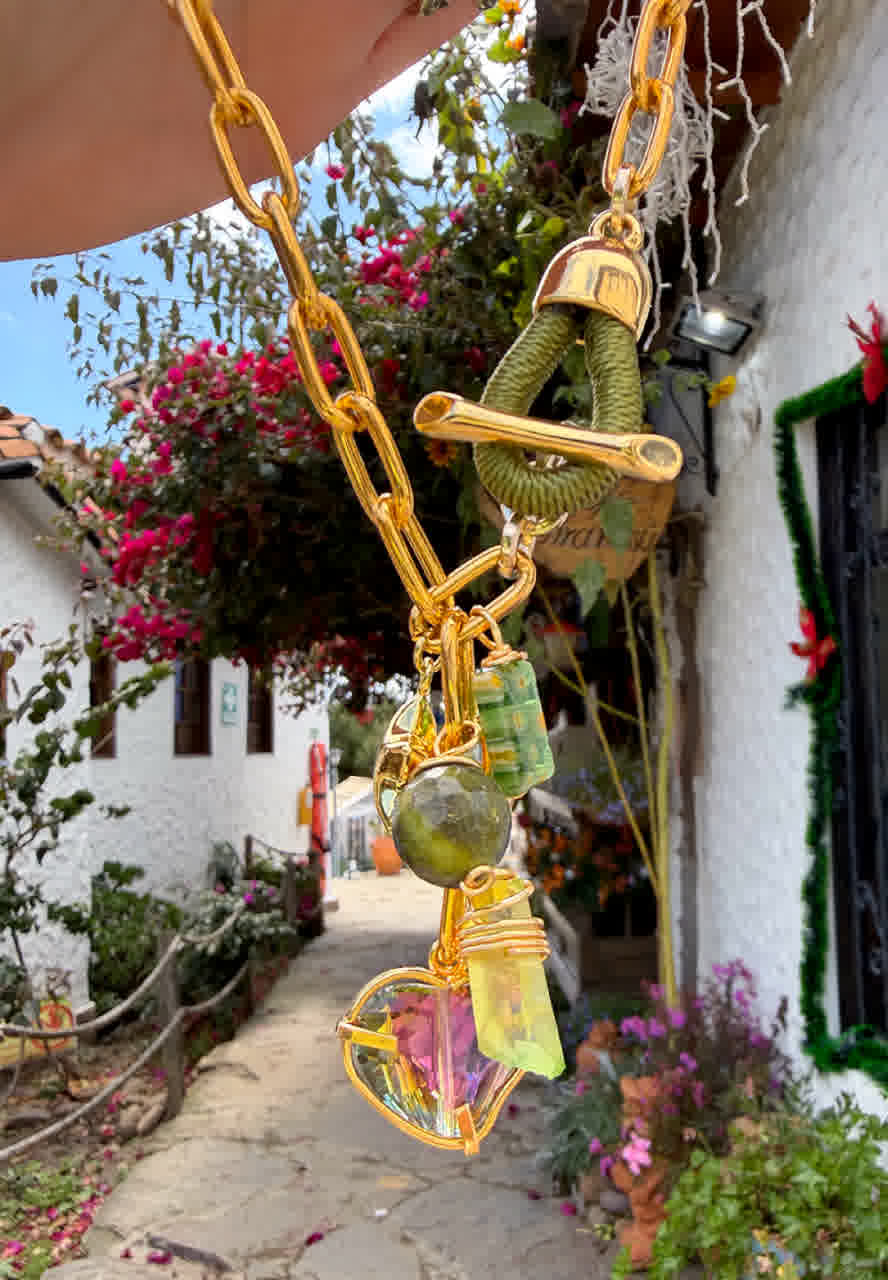 Elegancia de lo hecho a mano, Collar Mix de piedras semipreciosas , elaborada con herrajes en bronce de alta calidad y un doble baño de oro de 24k. Cada pieza es una creación única, hecha en Colombia, pensada para mujeres que valoran la exclusividad, el diseño artesanal y la moda consciente.