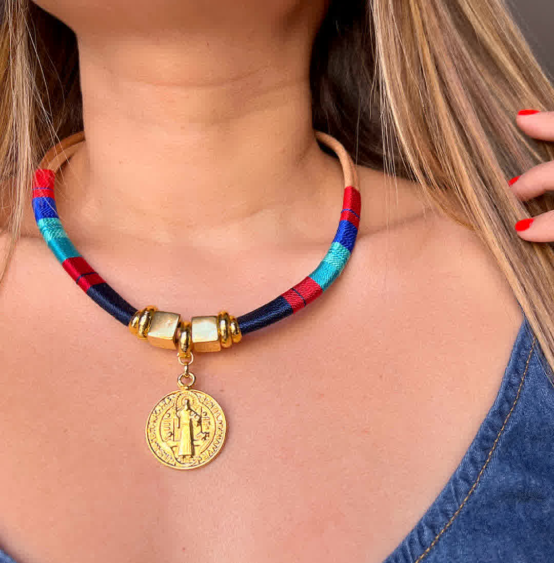 Elegancia de lo hecho a mano, Choker artesanal en cuero crudo, elaborada con herrajes en bronce de alta calidad y un doble baño de oro de 24k. Cada pieza es una creación única, hecha en Colombia, pensada para mujeres que valoran la exclusividad, el diseño artesanal y la moda consciente.
