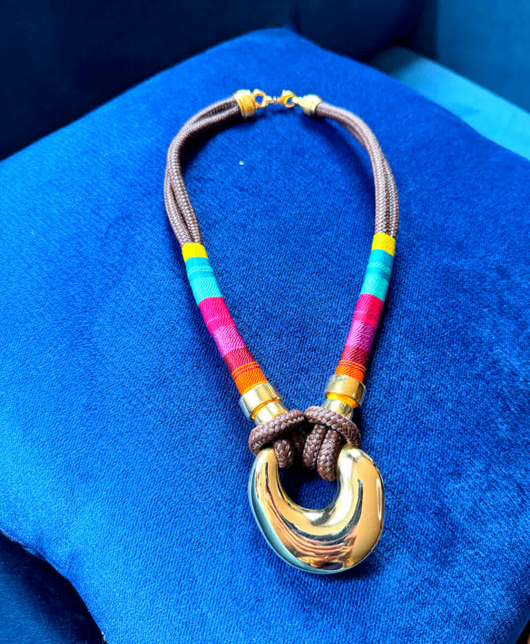 Sientete unica con nuestros collares artesanales que haran verte diferente,, collar artesanal en hilo seda, elaborada con herrajes en bronce de alta calidad y un doble baño de oro de 24k. Cada pieza es una creación única, hecha en Colombia, pensada para mujeres que valoran la exclusividad, el diseño artesanal y la moda consciente.