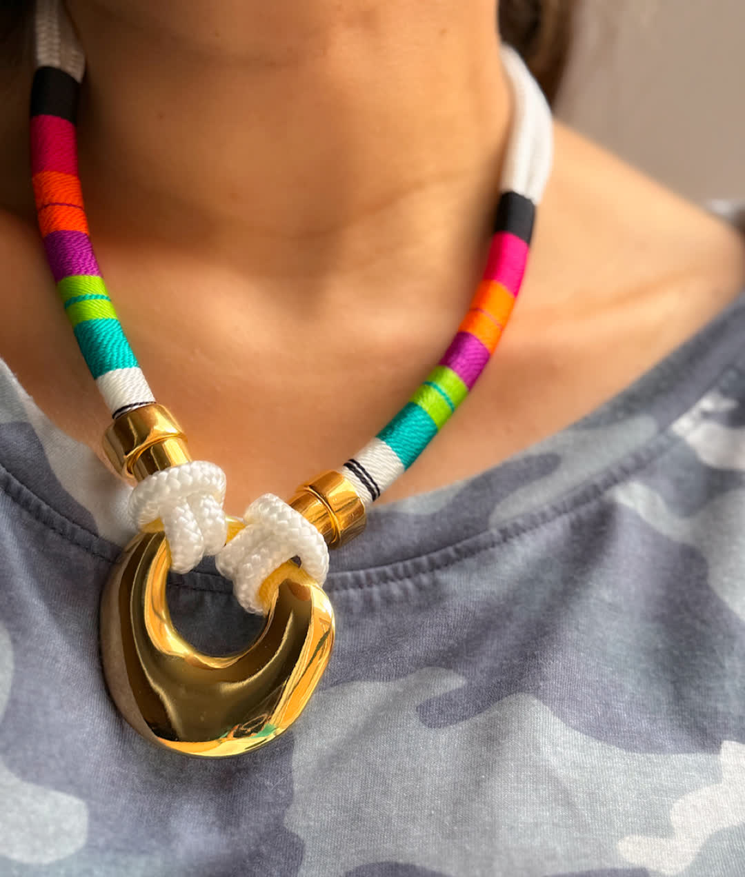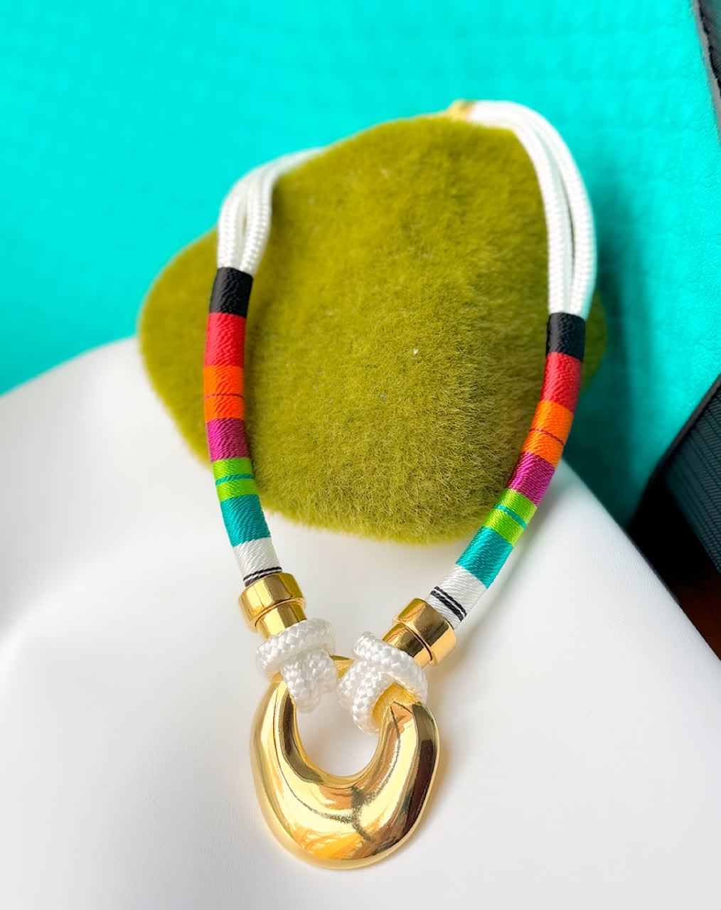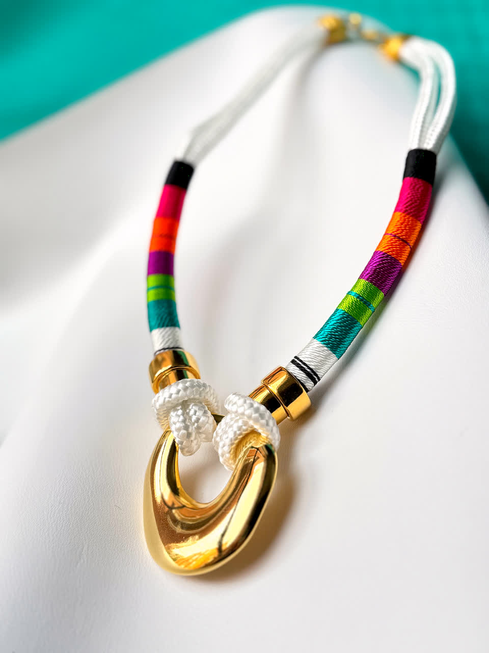Sientete unica con nuestros collares artesanales que haran verte diferente,, collar artesanal en hilo seda, elaborada con herrajes en bronce de alta calidad y un doble baño de oro de 24k. Cada pieza es una creación única, hecha en Colombia, pensada para mujeres que valoran la exclusividad, el diseño artesanal y la moda consciente.