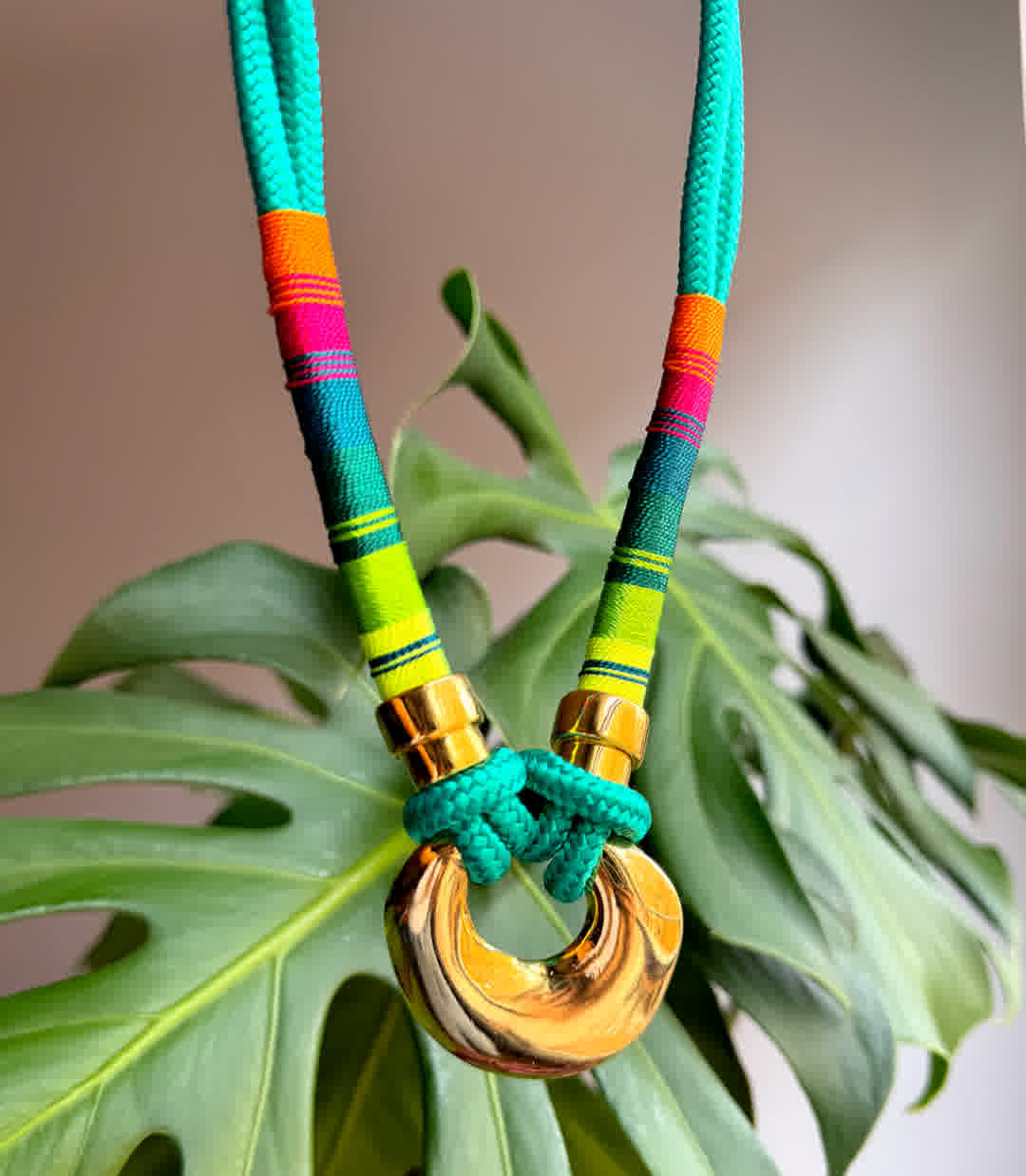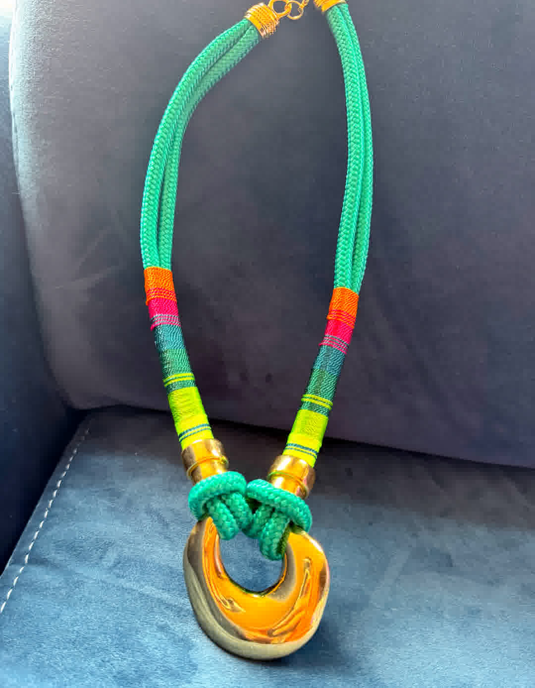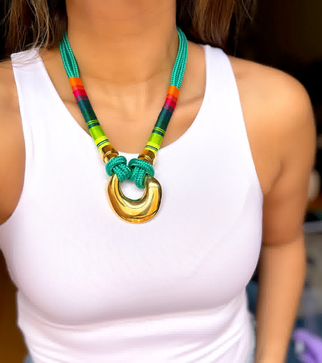 Sientete unica con nuestros collares artesanales que haran verte diferente,, collar artesanal en hilo seda, elaborada con herrajes en bronce de alta calidad y un doble baño de oro de 24k. Cada pieza es una creación única, hecha en Colombia, pensada para mujeres que valoran la exclusividad, el diseño artesanal y la moda consciente.