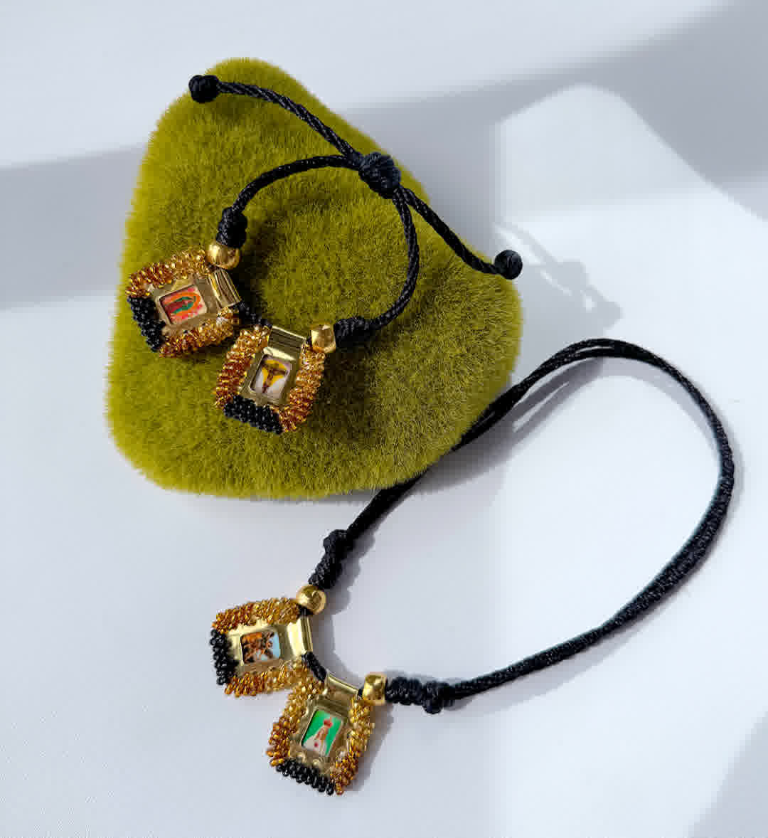 - Material: base en cordones , escapulario en microfibra recamado con mostacilla checa y herrajes en bronce con baño de oro 24k.