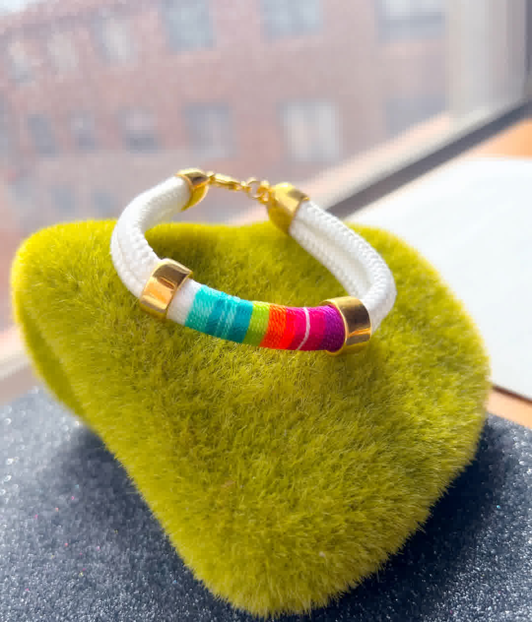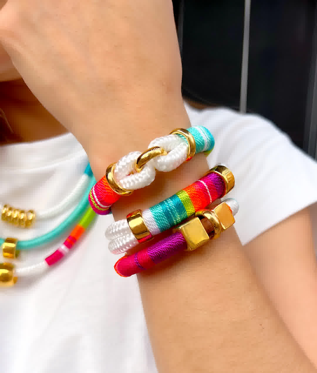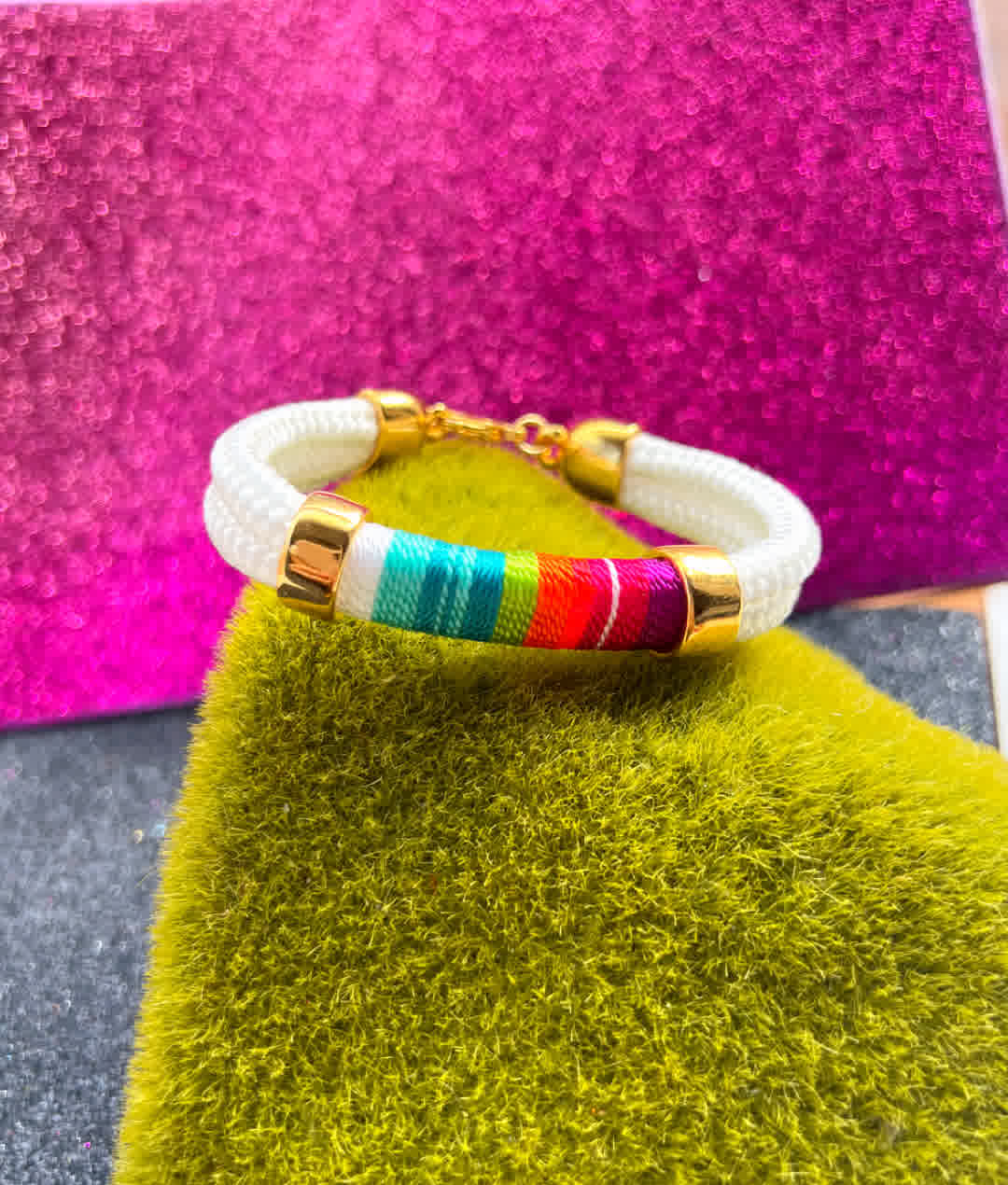 Elegancia de lo hecho a mano, Pulsera artesanal en hilo seda, elaborada con herrajes en bronce de alta calidad y un doble baño de oro de 24k. Cada pieza es una creación única, hecha en Colombia, pensada para mujeres que valoran la exclusividad, el diseño artesanal y la moda consciente.