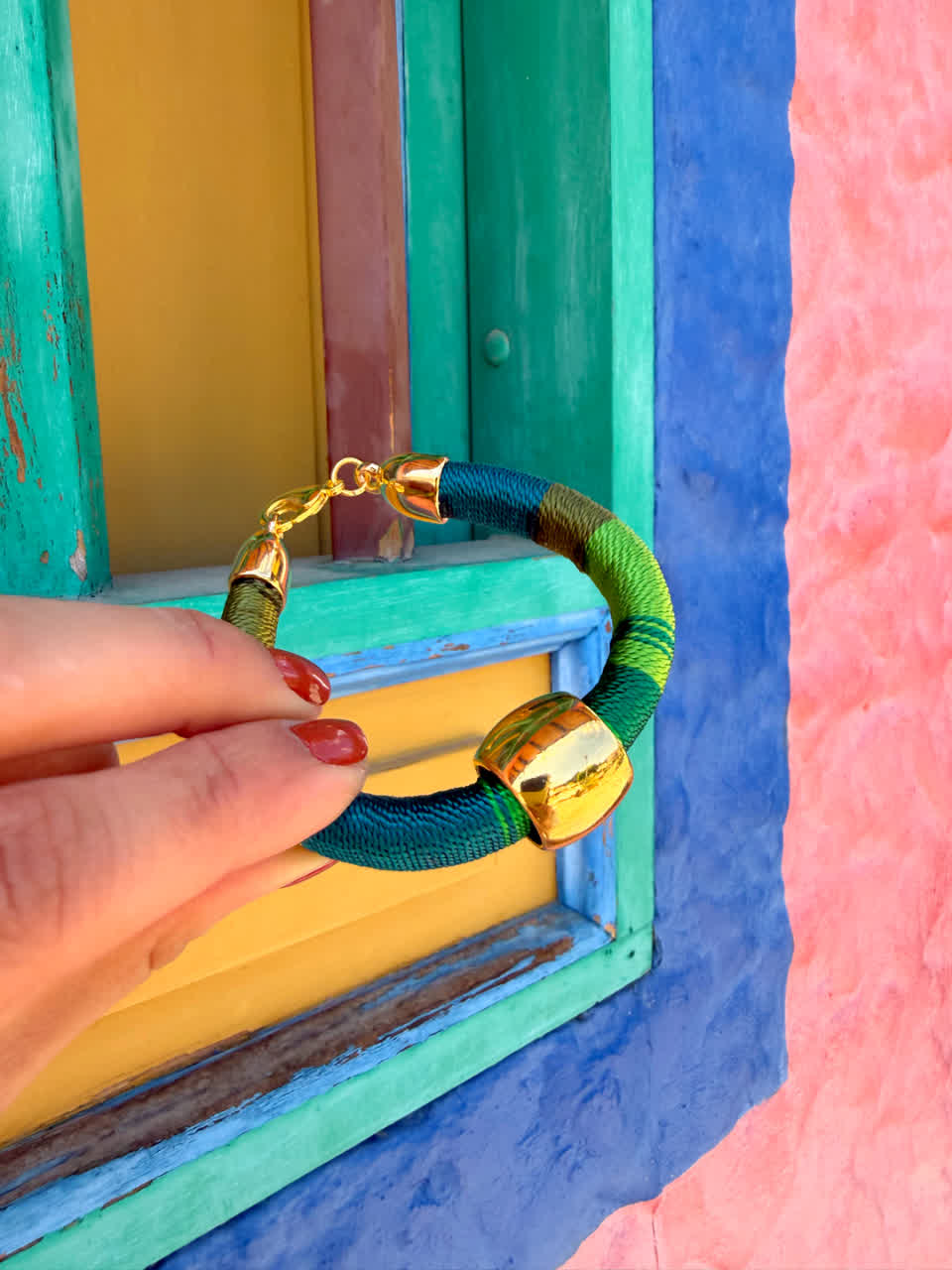 Elegancia de lo hecho a mano, Pulsera artesanal en hilo seda, elaborada con herrajes en bronce de alta calidad y un doble baño de oro de 24k. Cada pieza es una creación única, hecha en Colombia, pensada para mujeres que valoran la exclusividad, el diseño artesanal y la moda consciente.