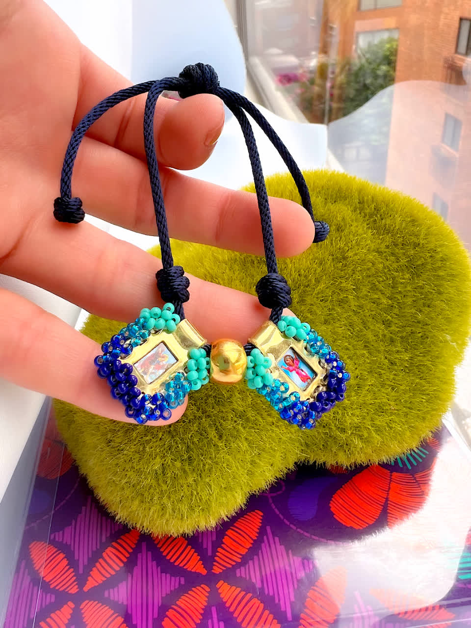 - Material: base en cordones , escapulario en microfibra recamado con mostacilla checa y herrajes en bronce con baño de oro 24k.