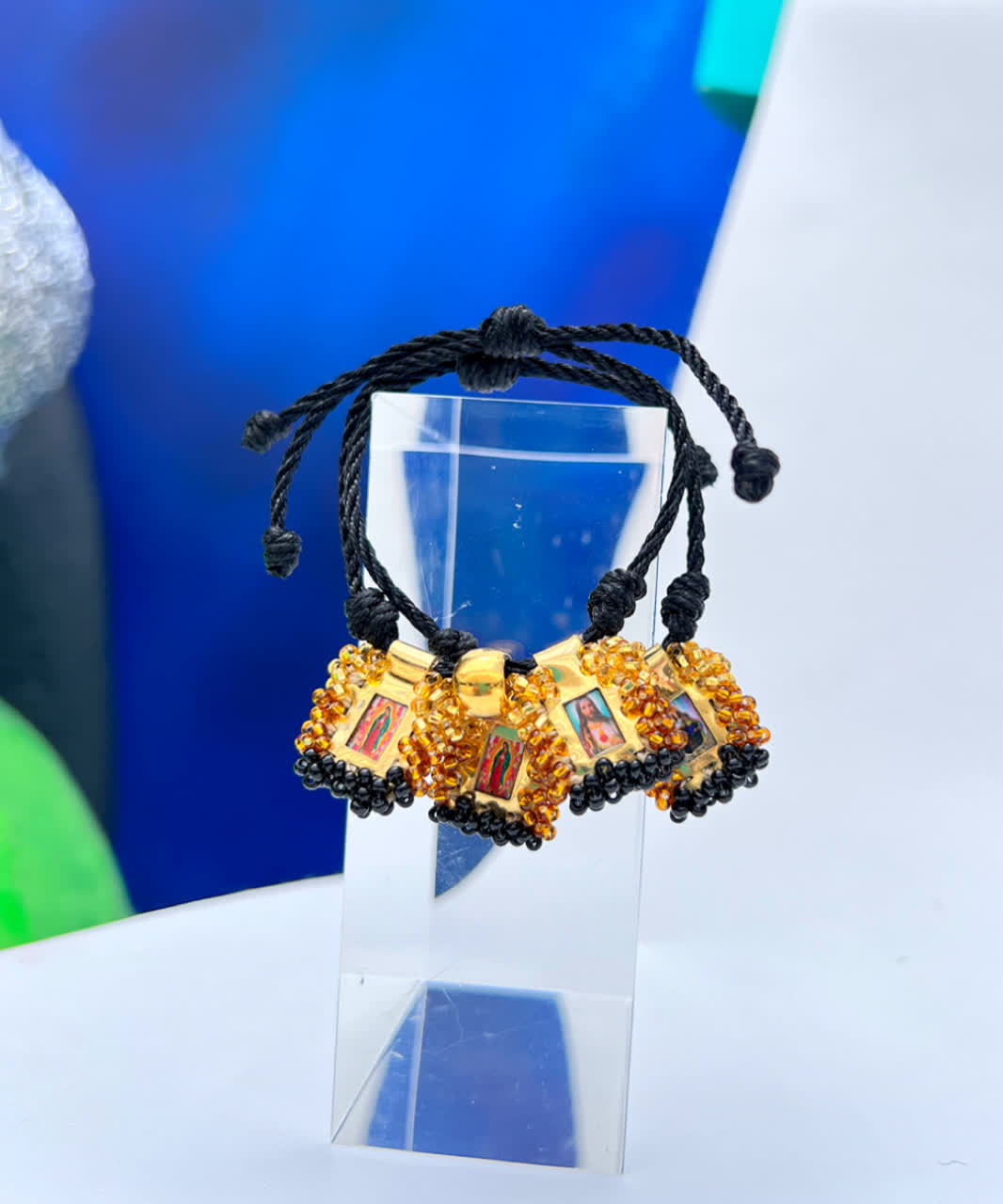 - Material: base en cordones , escapulario en microfibra recamado con mostacilla checa y herrajes en bronce con baño de oro 24k.
