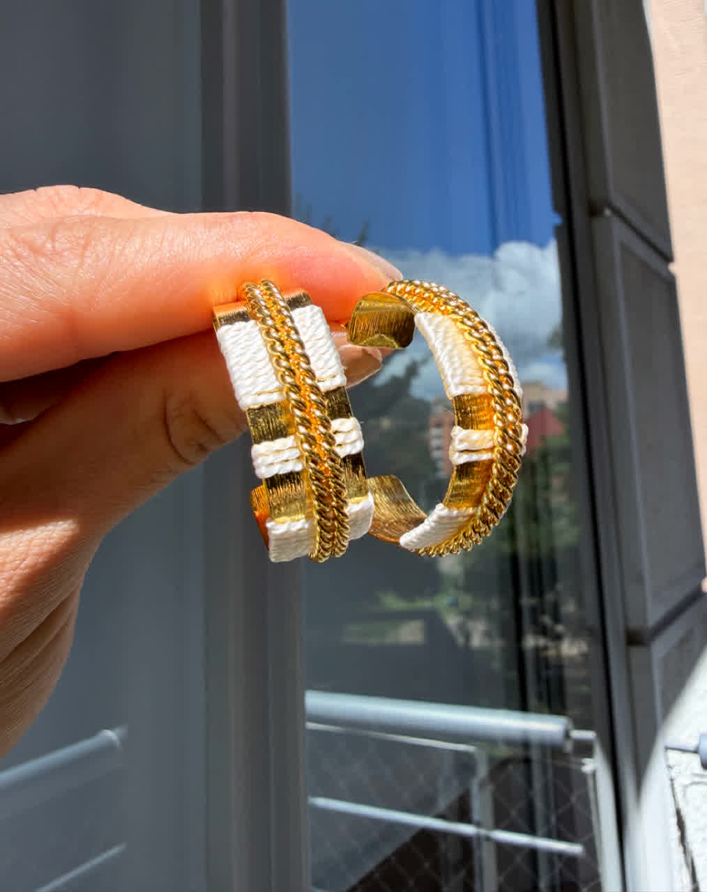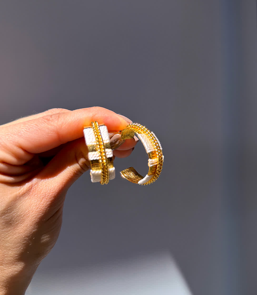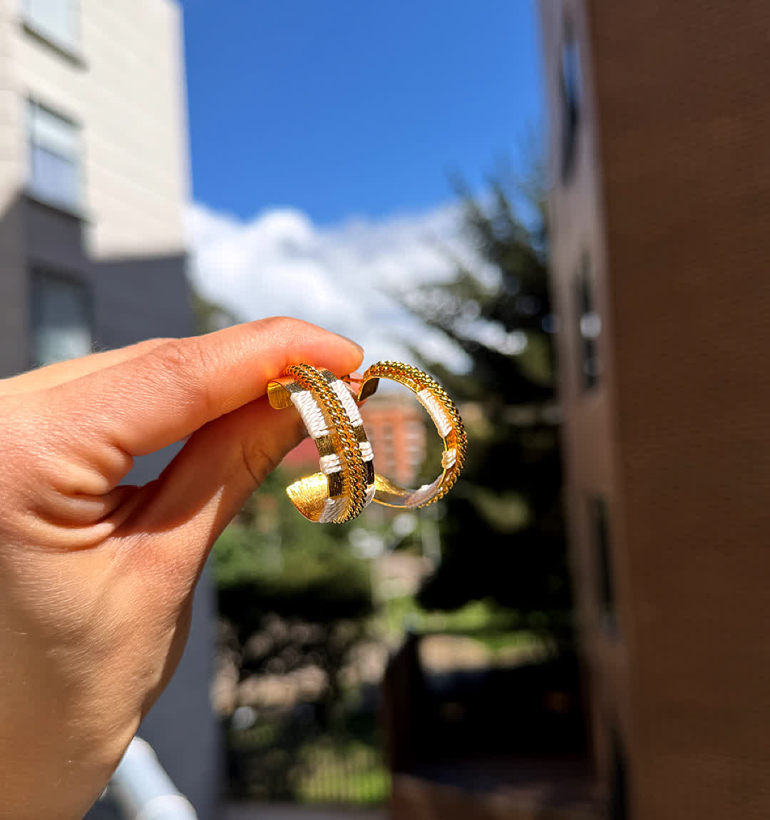 Sientete unica con nuestros aretes artesanales que haran verte diferente, Arete en hilo seda, elaborada con herrajes en bronce de alta calidad y un doble baño de oro de 24k. Cada pieza es una creación única, hecha en Colombia, pensada para mujeres que valoran la exclusividad, el diseño artesanal y la moda consciente.