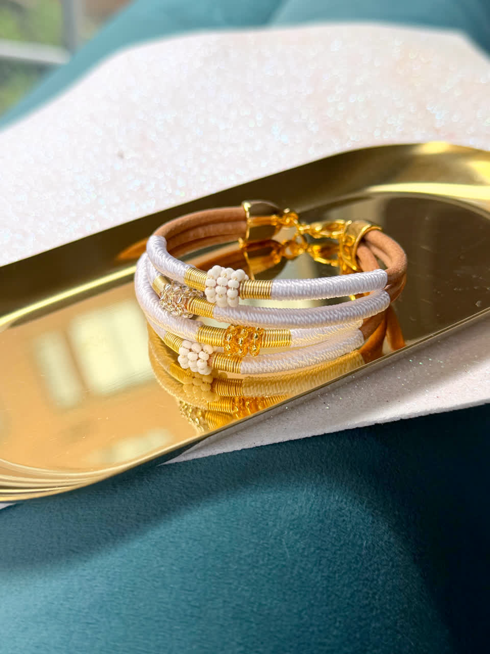 Elegancia de lo hecho a mano, Brazalete artesanal en hilo seda, elaborada con herrajes en bronce de alta calidad y un doble baño de oro de 24k. Cada pieza es una creación única, hecha en Colombia, pensada para mujeres que valoran la exclusividad, el diseño artesanal y la moda consciente.
