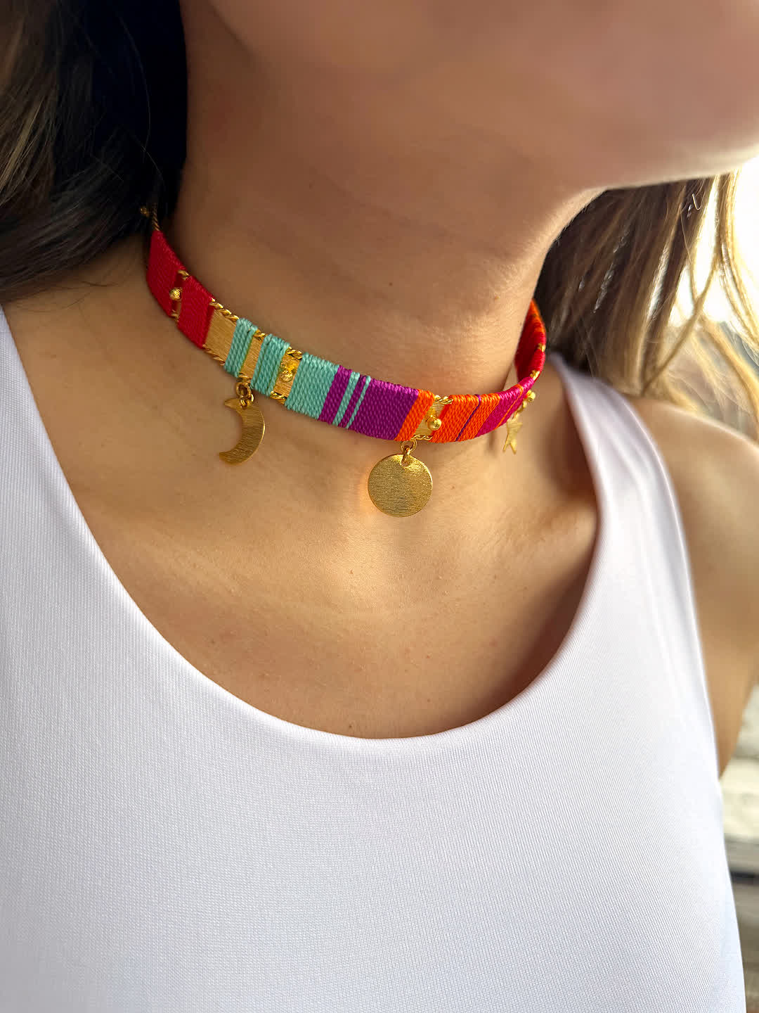 Elegancia de lo hecho a mano, Collar tipo Choker artesanal en hilo seda, elaborada con herrajes en bronce de alta calidad y un doble baño de oro de 24k. Cada pieza es una creación única, hecha en Colombia, pensada para mujeres que valoran la exclusividad, el diseño artesanal y la moda consciente.