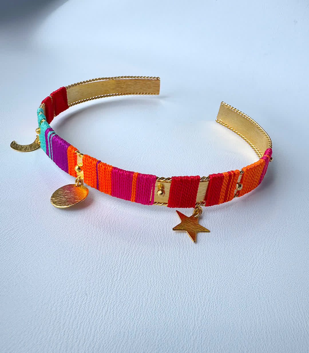 - Material: Base bronce con baño de oro 24k , tejido con Hilo seda