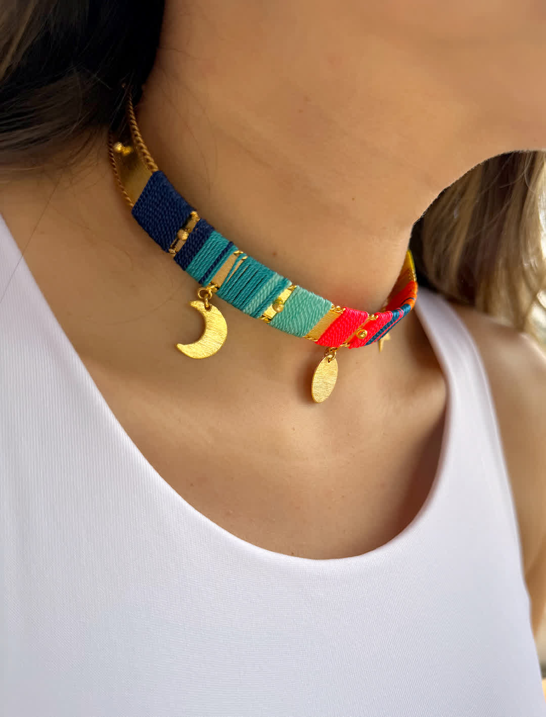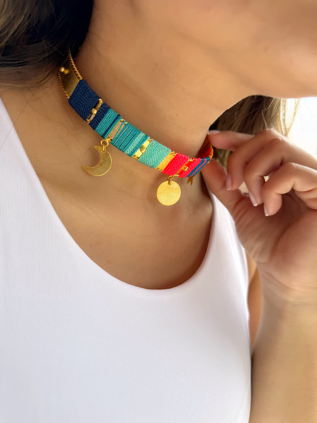 Elegancia de lo hecho a mano, Collar tipo Choker artesanal en hilo seda, elaborada con herrajes en bronce de alta calidad y un doble baño de oro de 24k. Cada pieza es una creación única, hecha en Colombia, pensada para mujeres que valoran la exclusividad, el diseño artesanal y la moda consciente.