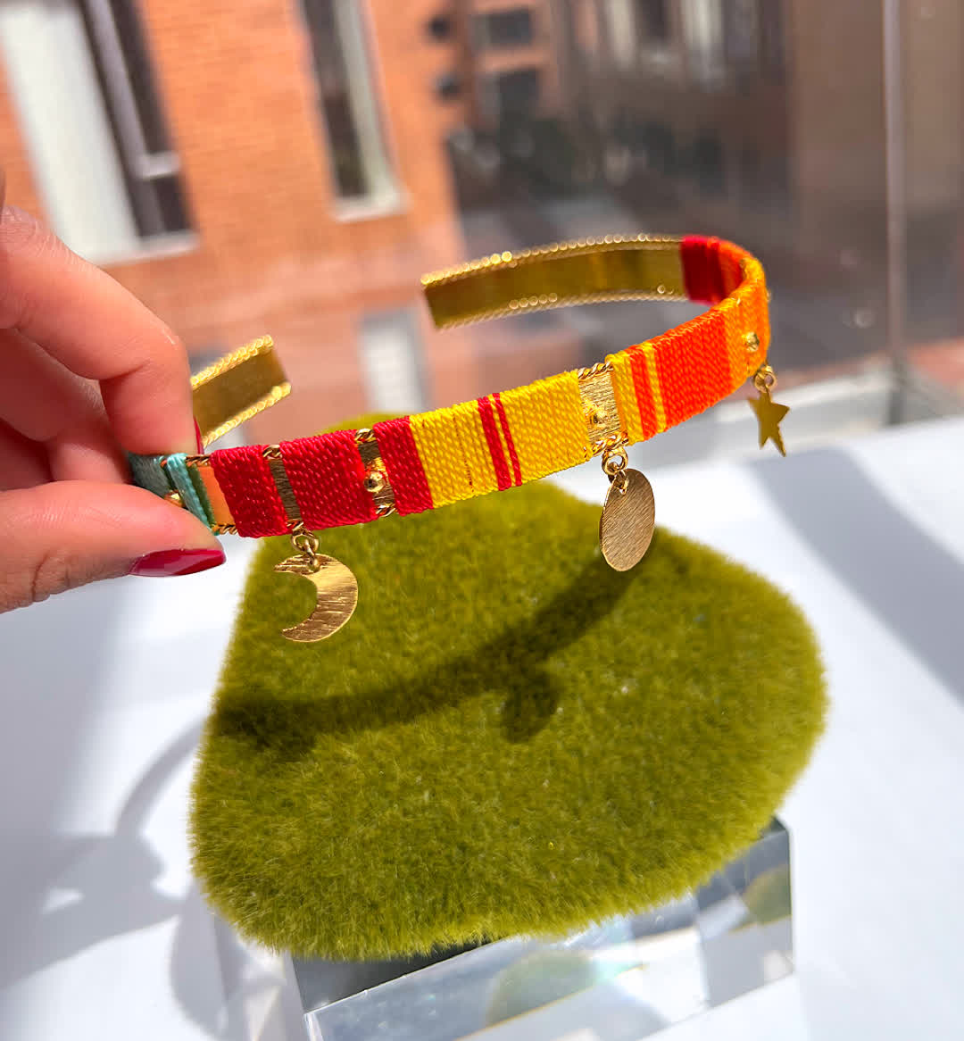Elegancia de lo hecho a mano, Collar tipo Choker artesanal en hilo seda, elaborada con herrajes en bronce de alta calidad y un doble baño de oro de 24k. Cada pieza es una creación única, hecha en Colombia, pensada para mujeres que valoran la exclusividad, el diseño artesanal y la moda consciente.
