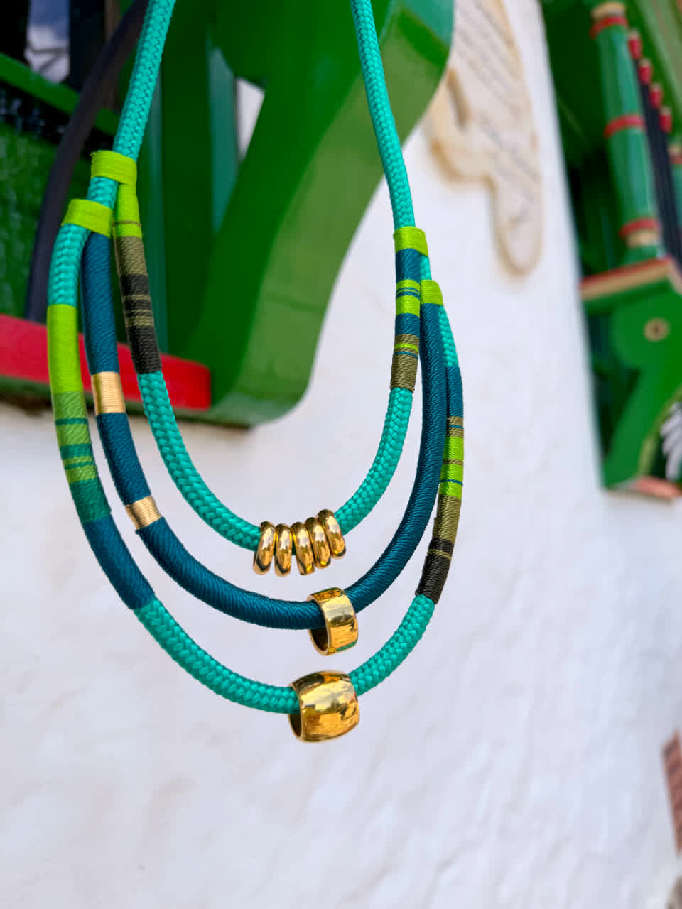 Elegancia de lo hecho a mano, Collar en cordon tejido con hilos sedas, elaborada con herrajes en bronce de alta calidad y un doble baño de oro de 24k. Cada pieza es una creación única, hecha en Colombia, pensada para mujeres que valoran la exclusividad, el diseño artesanal y la moda consciente.