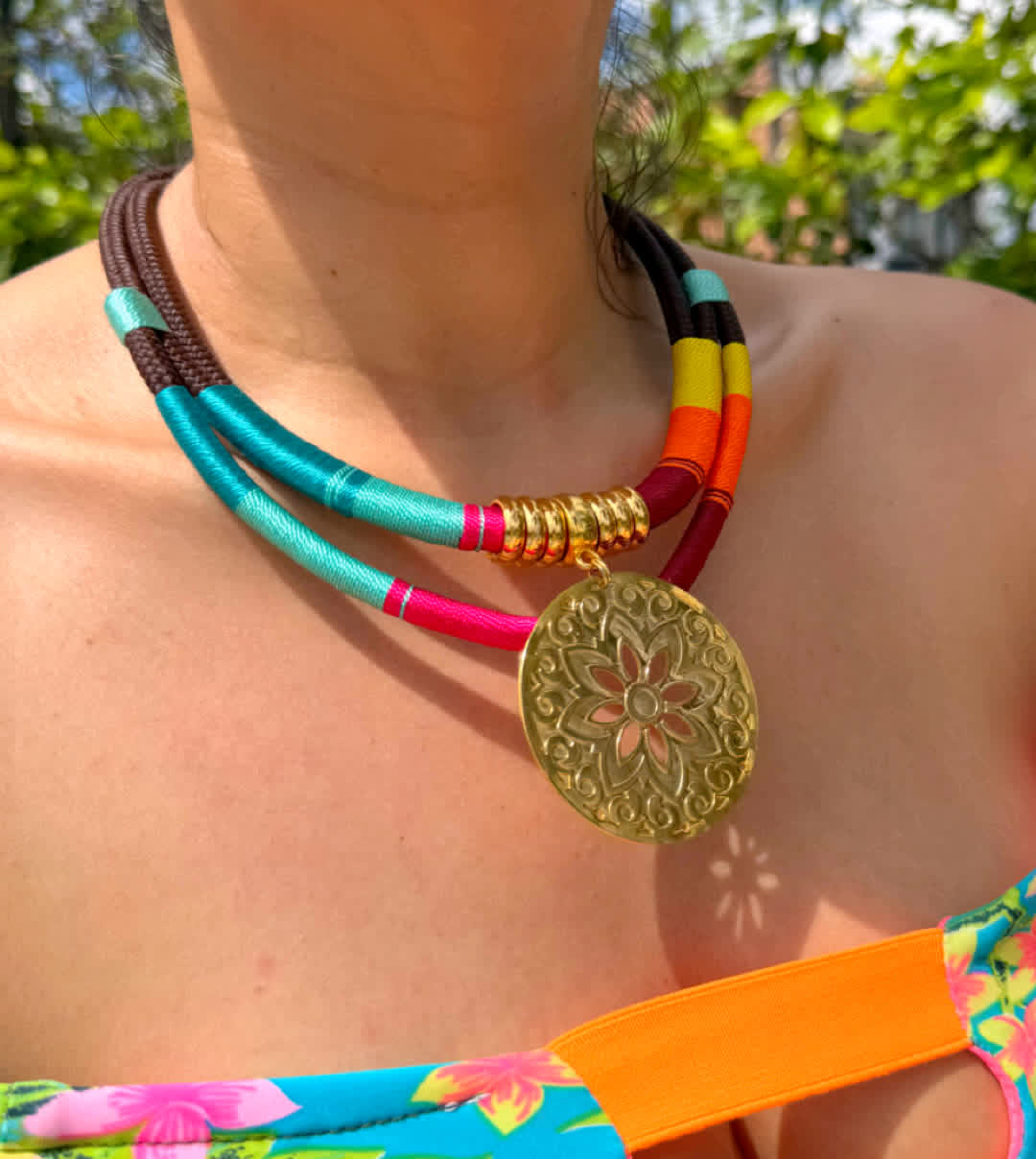 Elegancia de lo hecho a mano, Collar artesanal en hilo seda, elaborada con herrajes en bronce de alta calidad y un doble baño de oro de 24k. Cada pieza es una creación única, hecha en Colombia, pensada para mujeres que valoran la exclusividad, el diseño artesanal y la moda consciente.