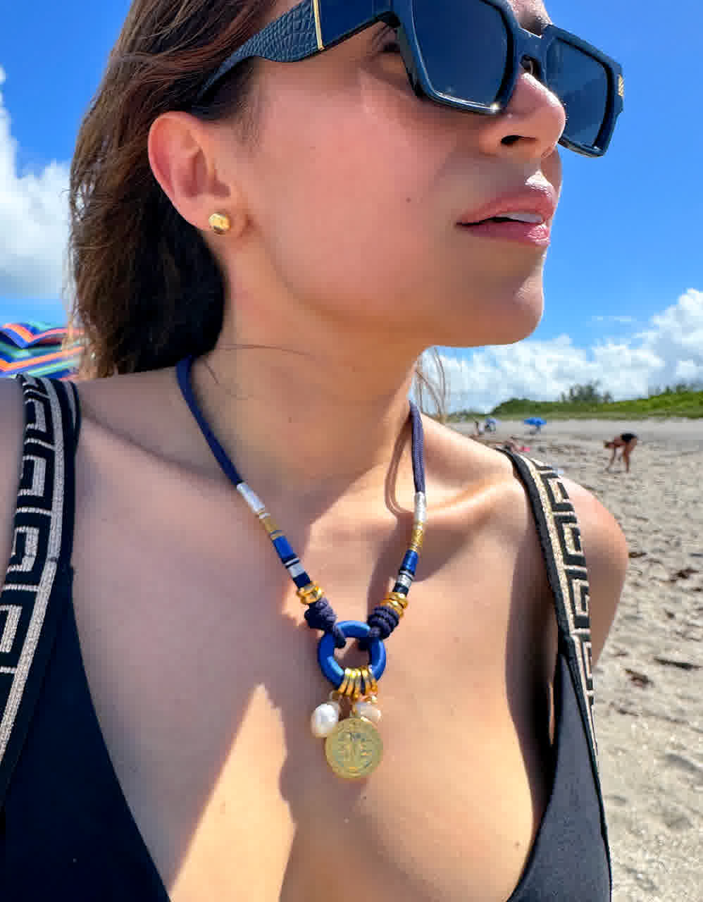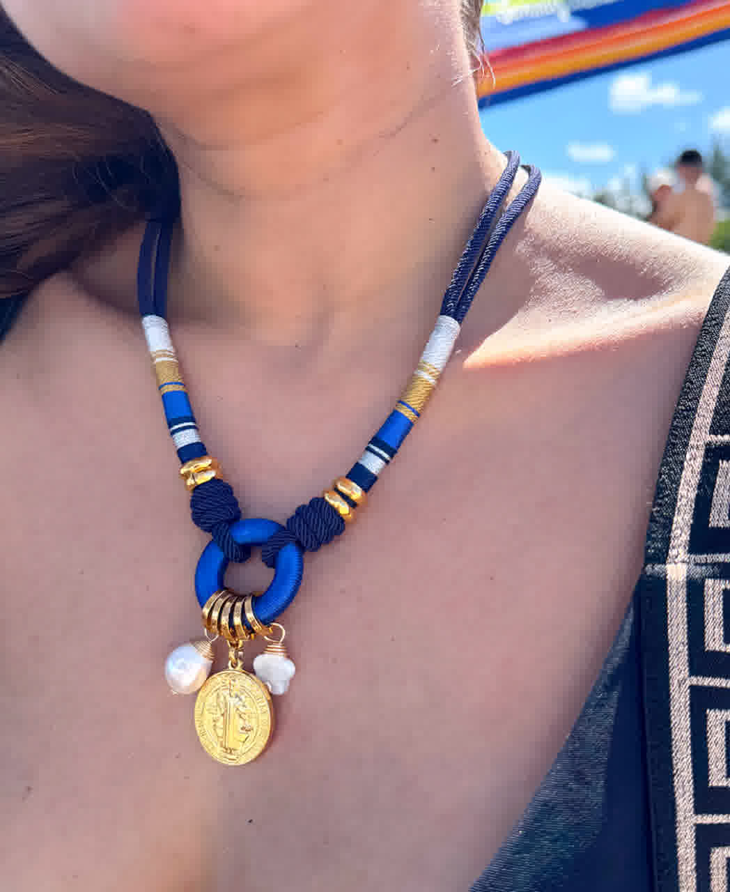 Sientete unica con nuestros collares artesanales que haran verte diferente,, collar artesanal en hilo seda, elaborada con herrajes en bronce de alta calidad y un doble baño de oro de 24k. Cada pieza es una creación única, hecha en Colombia, pensada para mujeres que valoran la exclusividad, el diseño artesanal y la moda consciente.