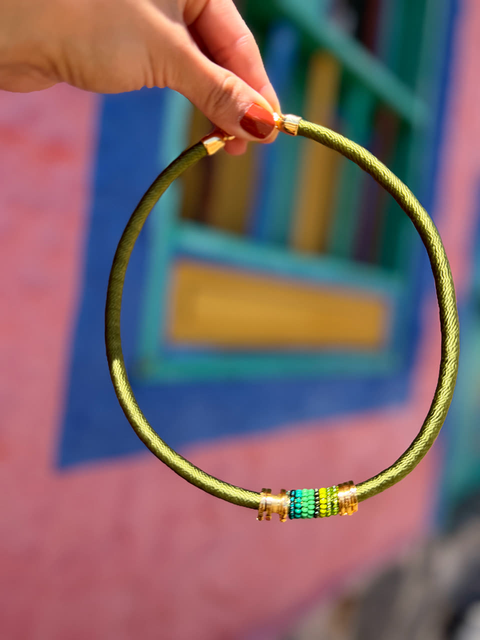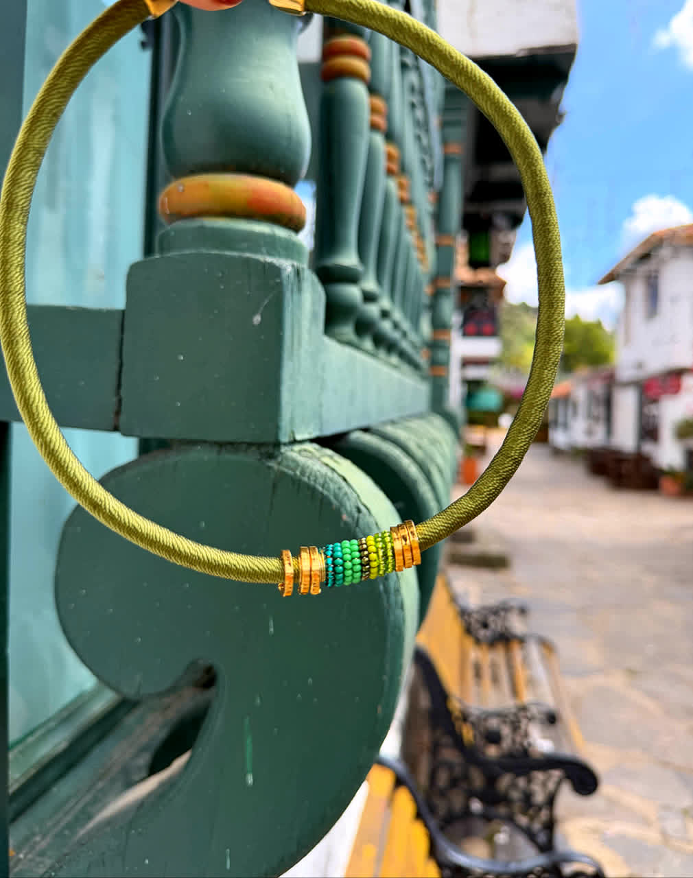 Elegancia de lo hecho a mano, collar artesanal en hilo seda, elaborada con herrajes en bronce de alta calidad y un doble baño de oro de 24k. Cada pieza es una creación única, hecha en Colombia, pensada para mujeres que valoran la exclusividad, el diseño artesanal y la moda consciente.
